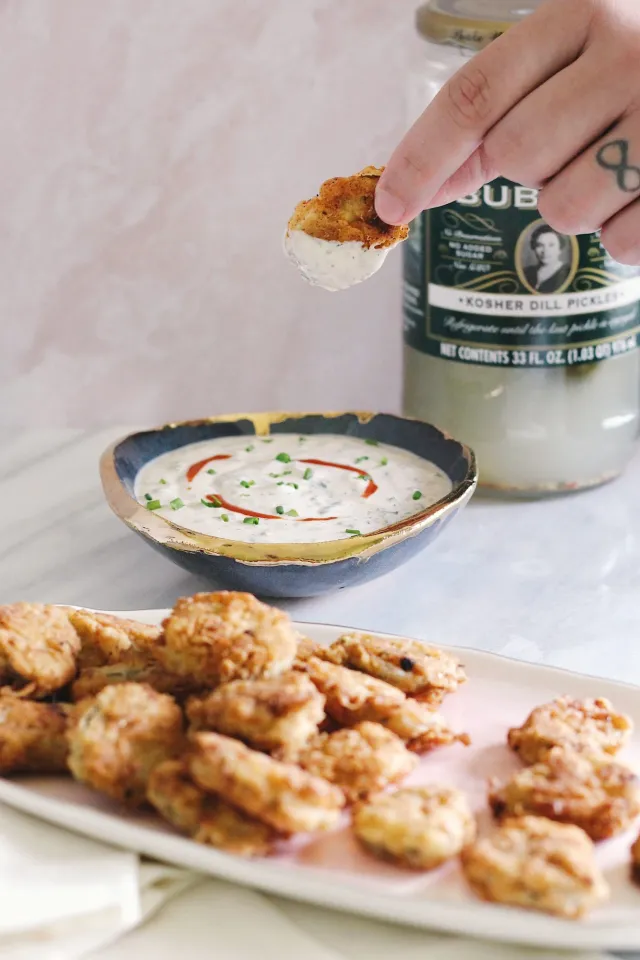 Once your chicken is ready and crisp, dunk your nuggets in the hot oil and cool on the baking sheet with paprika and salt to top. Serve with pickles!