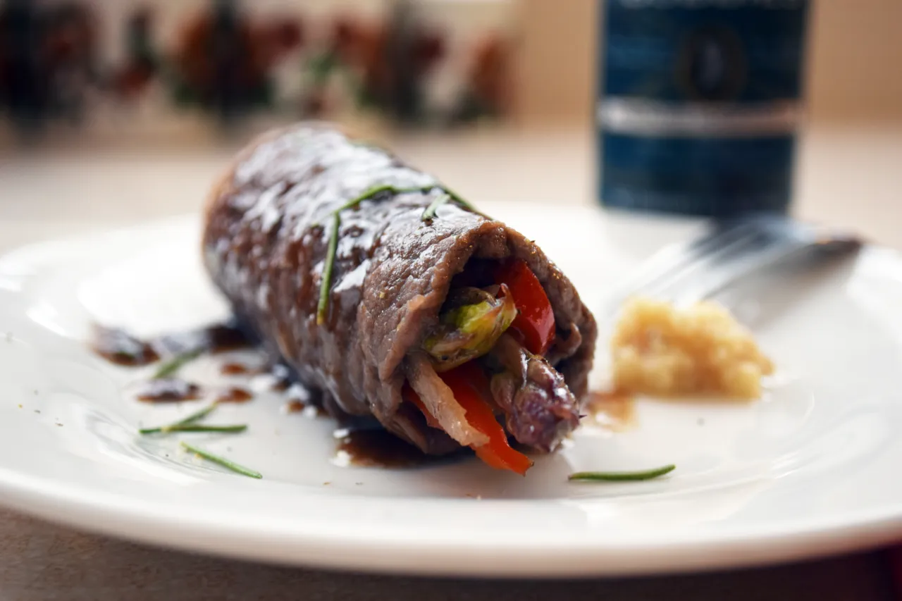Drain your sauerkraut and set aside. Cut the carrots, green onions, and bell pepper into thin strips; cut asparagus spears to approximately 5-6 inches long. Saute all veggies except the sauerkraut together in butter for 5-7 minutes on medium heat, until they’re lightly softened and still crisp. Remove from heat. Add sauerkraut to the mixture. Place some of the veggie mixture on one end of the beef, and roll it up. Secure each end with toothpicks. Repeat with the rest of the veggies and meat. Brown the beef on all sides, keeping the toothpicks in place. You may find it easiest to put the toothpick on its point and push the meat down it with a fork, to brown those areas where the toothpicks are. Repeat for the other side. Once browned, remove them from the pan.