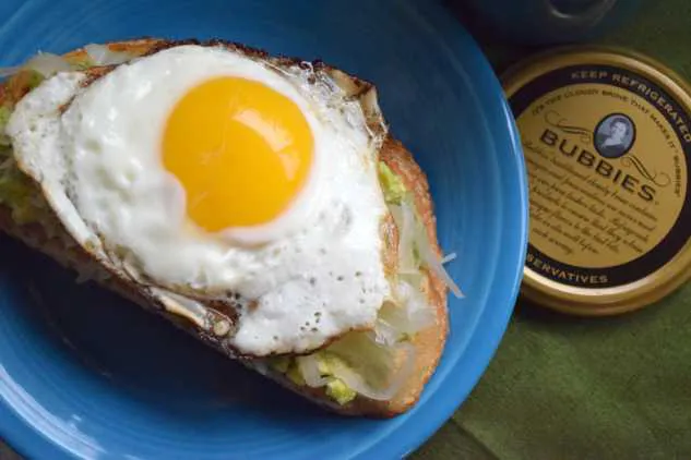 Assemble your breakfast sandwich - to the bottom half of each english muffin, add tomato slices and veggie patty. Spread a layer of horseradish cream sauce on top of veggie patty and top with Bubbies sauerkraut.