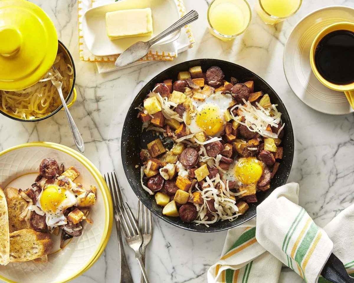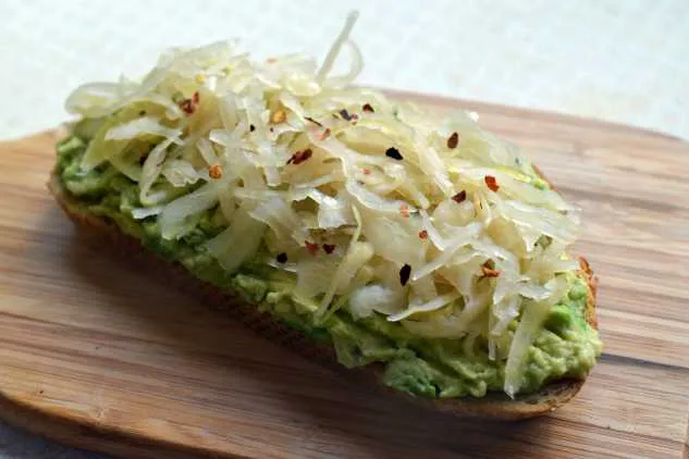 Next, top with avocado slices and cooked egg. Optional: finish with extra sauerkraut.